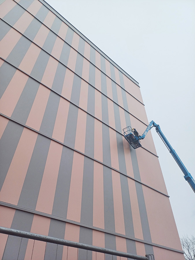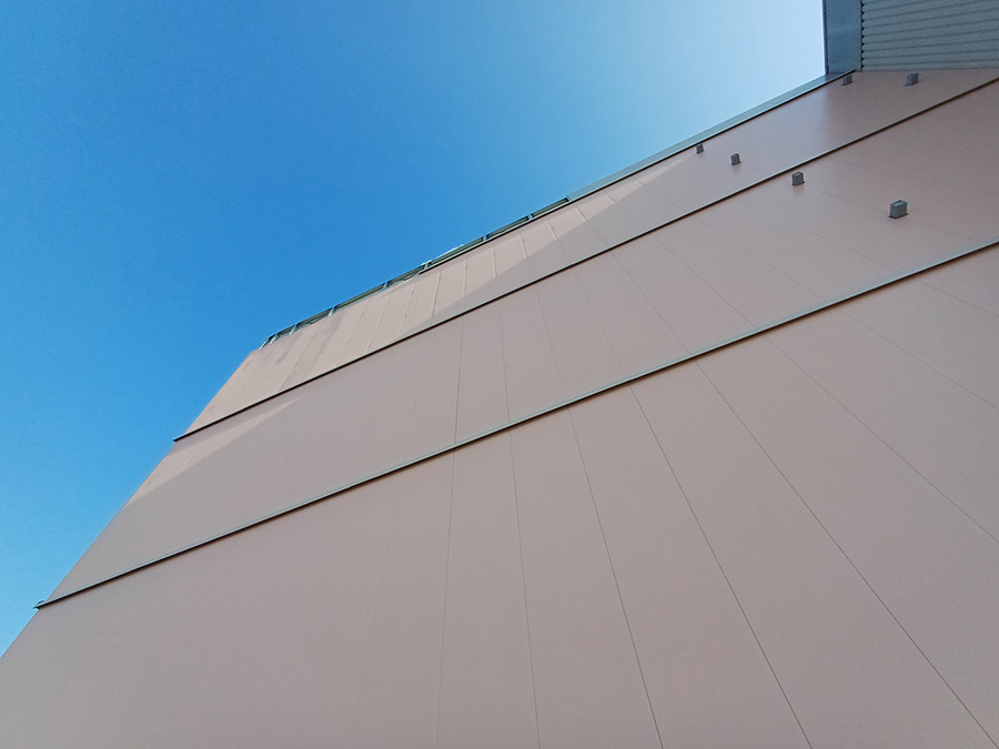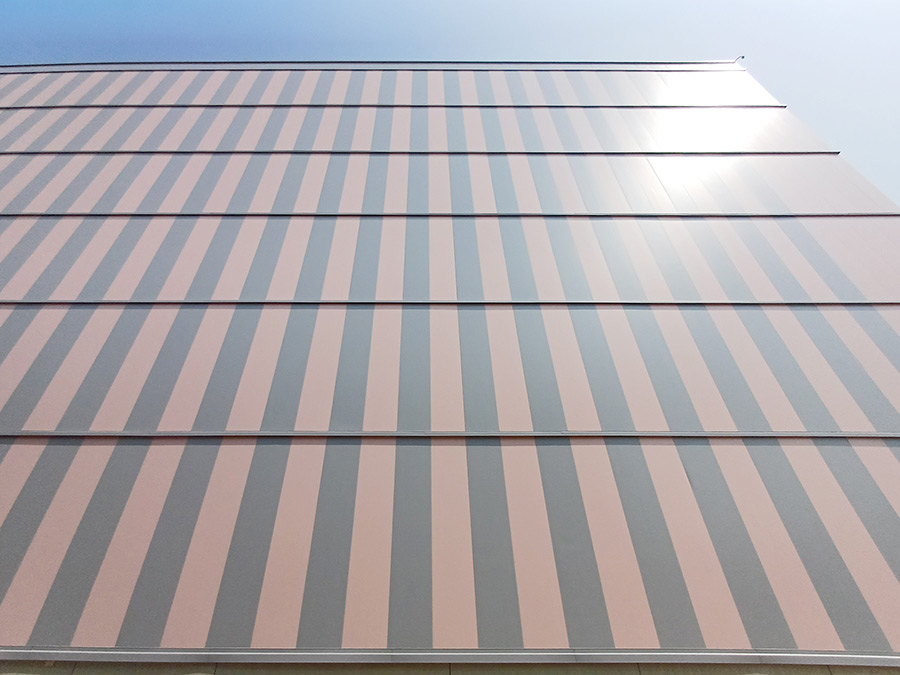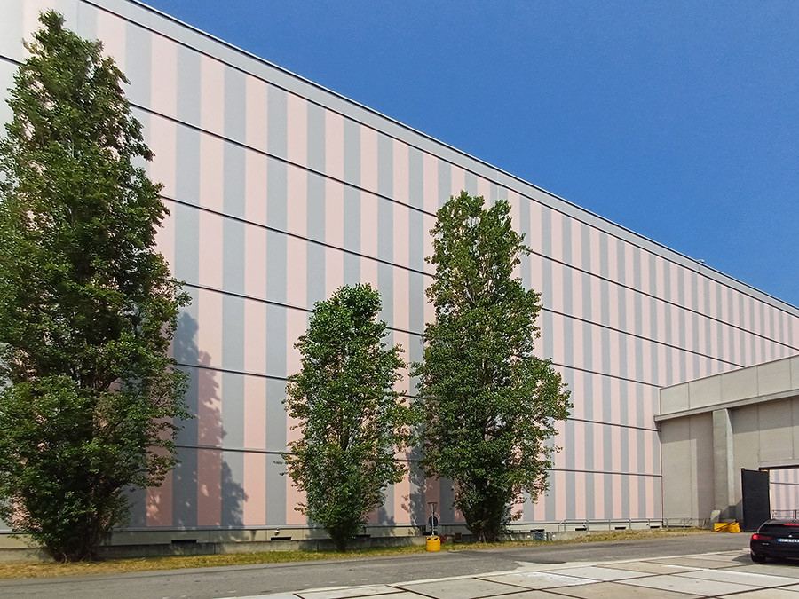 A legare visivamente le due strutture ci sono le tonalità del grigio RAL 3502 e del rosa RAL 1020, scelte per creare un equilibrio armonico tra passato e presente, tecnica ed estetica.