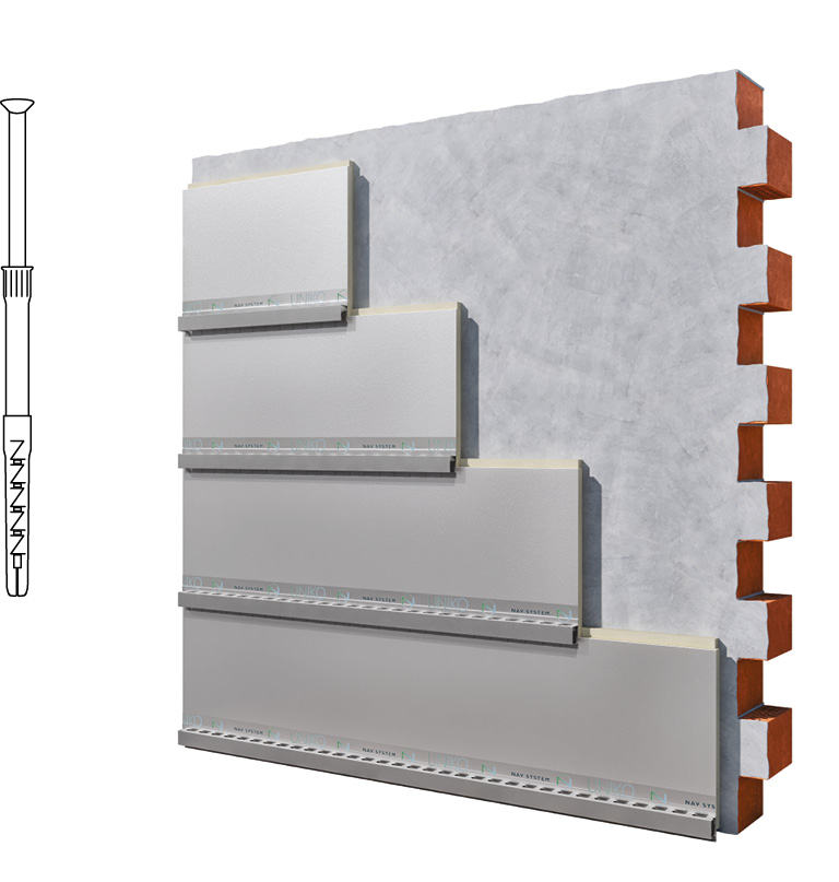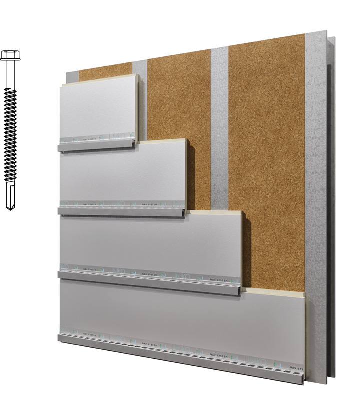 Composto da una schiuma poliuretanica o in poliisocianurato, prodotto negli spessori di 60, 80, 100, 120, 140, 150, 160, 180 e 200 mm, permette di migliorare la resistenza termica in facciata, in funzione delle differenti richieste per quanto riguarda comfort abitativo e di miglior risparmio energetico. Il pannello UNIKO di Nav System è rivestito sui due lati con alluminio centesimale goffrato, è reso portante dal correntino forato, che oltre a garantire una resistenza statica del pannello, funge da supporto al manto di copertura, favorendo la microventilazione ed il convogliamento in gronda di eventuali infiltrazioni meteoriche.